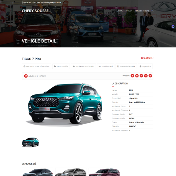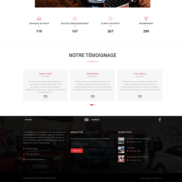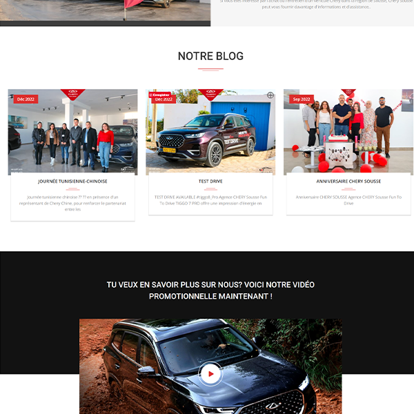 Développement d’un site dynamique et responsive pour présenter la gamme Chery, les offres du moment, et faciliter la prise de contact.